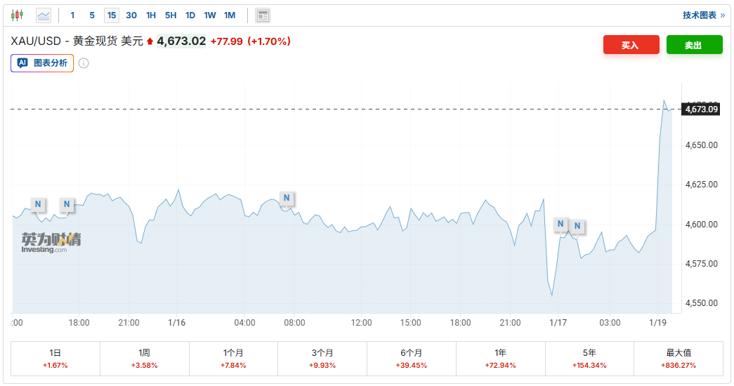 智通财经获悉,在美国总统特朗普威胁将对八个反对其接管格陵兰岛的欧洲国家加征关税后,避险情绪推动黄金价格升至历史新高。截至发稿,现货黄金价格涨1.70%,至4673.02美元/盎司,日内早些时候一度涨至4690.75美元/盎司的历史新高。