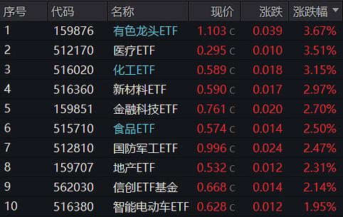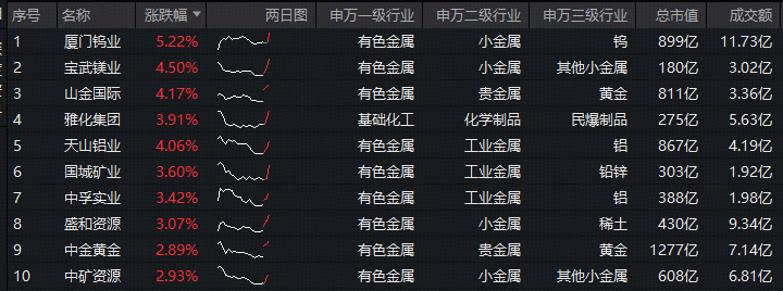 成份股方面,厦门钨业领涨超5%,宝武镁业、山金国际、天山铝业涨逾4%,雅化集团、国城矿业、中孚实业、盛和资源等个股跟涨。权重股方面,北方稀土涨超2%,山东黄金涨逾1%。