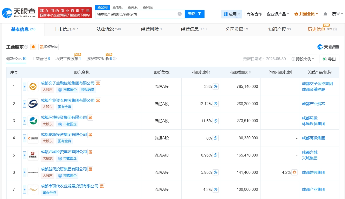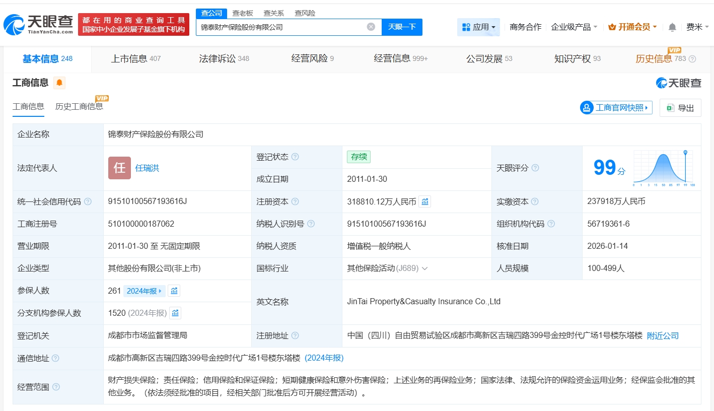 正文 锦泰保险增资至31.9亿 增幅约34% 三木 V管理员 /01-21 /0 评论 /8 阅读 0121 文章最后更新时间2026年01月21日,若文章内容或图片失效,请留言反馈! 天眼查工商信息显示,近日,锦泰财产保险股份有限公司发生工商变更,注册资本由约23.8亿人民币增至约31.9亿人民币,增幅约34%,同时,多位主要人员发生变更。 锦泰财产保险股份有限公司成立于2011年1月,法定代表人为任瑞洪,经营范围包括财产损失保险、责任保险、信用保险和保证保险等。股东信息显示,该公司由成都交子金融控股集团有限公司、成都产业资本控股集团有限公司、成都环境投资集团有限公司等共同持股。 关键词阅读: