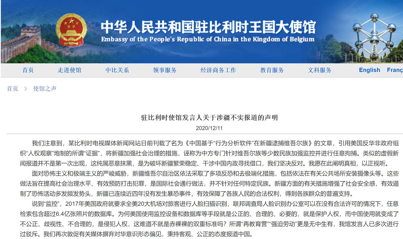 中国驻比利时使馆发言人表示,中方注意到有关报告。比利时国家安全部门在没有任何事实依据的情况下对中方妄加指责,散布涉华虚假信息,极不严肃、极不负责任。有关内容充斥着主观猜忌和意识形态偏见,恶意污蔑抹黑中国形象,中方对此表示强烈不满和坚决反对。