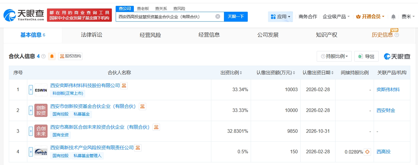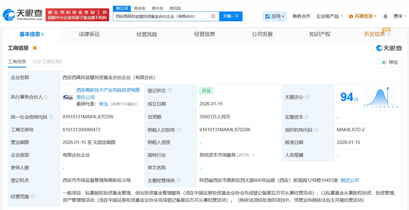 正文 西安奕材等成立投资基金 出资额约3亿 三木 V管理员 /01-21 /0 评论 /9 阅读 0121 文章最后更新时间2026年01月21日,若文章内容或图片失效,请留言反馈! 天眼查工商信息显示,近日,西安西高投益慧投资基金合伙企业(有限合伙)成立,执行事务合伙人为西安高新技术产业风险投资有限责任公司,出资额约3亿人民币,经营范围为私募股权投资基金管理、创业投资基金管理服务,以私募基金从事股权投资、投资管理、资产管理等活动。合伙人信息显示,该基金由西安奕材(688783)、西安市创新投资基金合伙企业(有限合伙)、西安市高新区合创未来投资合伙企业(有限合伙)、西安高新技术产业风险投资有限责任公司共同出资。 关键词阅读: