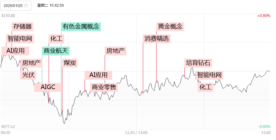 1月20日,三大指数集体收跌,创业板指盘中一度下跌超过2%。沪深两市成交额2.78万亿,较上一个交易日放量694亿。盘面上,全市场超3100只个股下跌,62只股票涨停。从板块来看,化工板块逆势爆发,十余只成分股涨停,红宝丽、山东赫达、维远股份、红墙股份涨停。贵金属概念延续强势,湖南白银涨停。房地产板块表现活跃,大悦城、城投控股涨停。AI应用端局部走高,佳云科技、粤传媒、浙文互联涨停。下跌方面,算力硬件、商业航天等板块跌幅居前。其中商业航天概念股集体大跌,神剑股份4连跌停,航天动力2连跌停。截至收盘,沪指跌0.01%,深成指跌0.97%,创业板指跌1.79%。