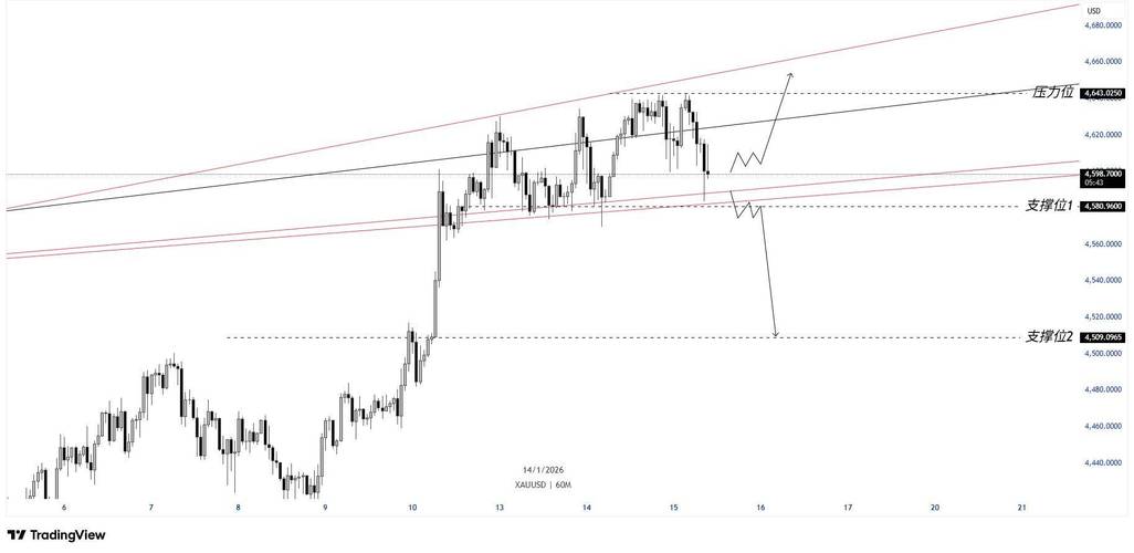 从趋势延伸角度看,若价格有效消化 4700 上方的抛压并完成横向整理,不排除进一步向 4816 美元一线的上方阻力区发起冲击,该位置对应更高周期通道目标位及潜在情绪推动下的延伸空间。整体而言,只要价格仍维持在上升通道内部运行,且未有效跌破 4596 美元关键支撑,黄金中期趋势仍偏向震荡走高,当前更倾向于高位强势整理而非趋势反转,短线波动主要取决于风险情绪变化与宏观事件对市场预期的扰动。