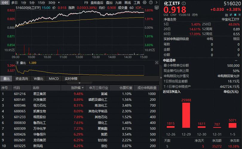 成份股方面,涂料、氮肥、石化等板块部分个股涨幅居前。截至发稿,三棵树飙涨超9%,鲁西化工大涨超8%,卫星化学涨超5%,恒力石化、华鲁恒升、万华化学等多股涨超4%。