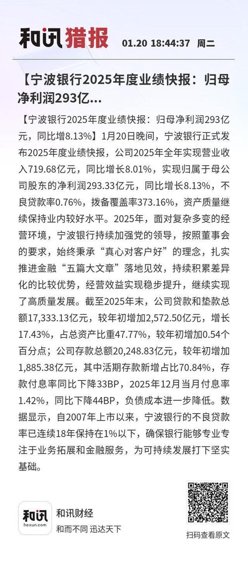 1月20日晚间,宁波银行正式发布2025年度业绩快报,公司2025年全年实现营业收入719.68亿元,同比增长8.01%,实现归属于母公司股东的净利润293.33亿元,同比增长8.13%,不良贷款率0.76%,资产质量继续保持业内较好水平。
