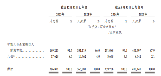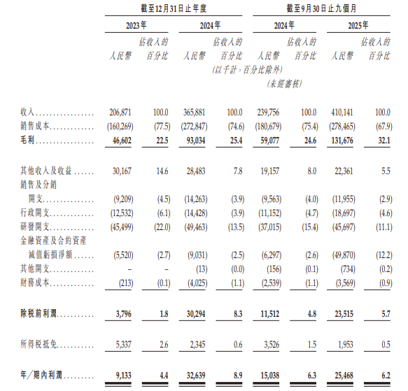 弗若斯特沙利文报告指出,玖物智能是中国智能具身产业机器人解决方案行业中少数实现盈利的企业之一。财务数据显示,于2023年度、2024年度、2024年以及2025年截至9月30日止九个月,玖物智能实现营业收入分别约为2.07亿元、3.66亿元、2.40亿元、4.10亿元人民币;归母净利润分别为913.3万元、3263.9万元、1503.8万元、2546.8万元人民币。增长势头持续强劲。