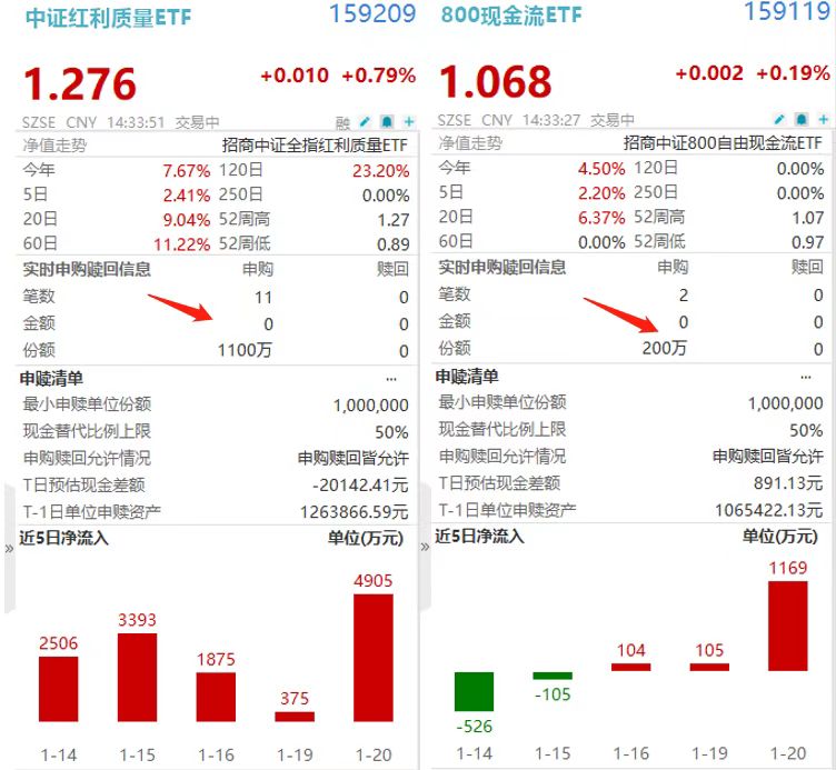 1月21日,两市午后震荡盘整。截至14时32分,中证红利质量ETF(159209)、800现金流ETF(159119)分别涨0.79%、0.19%,一度分别涨1.18%、0.66%。盘中双双录得净流入。
