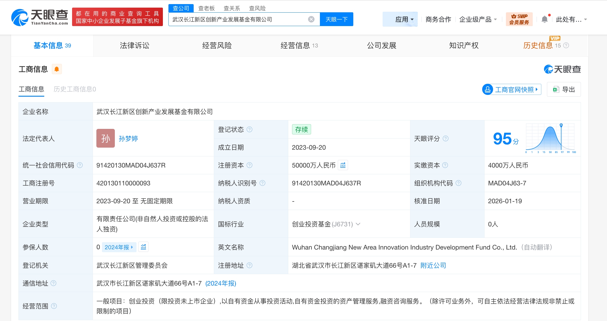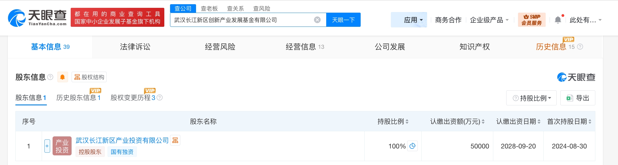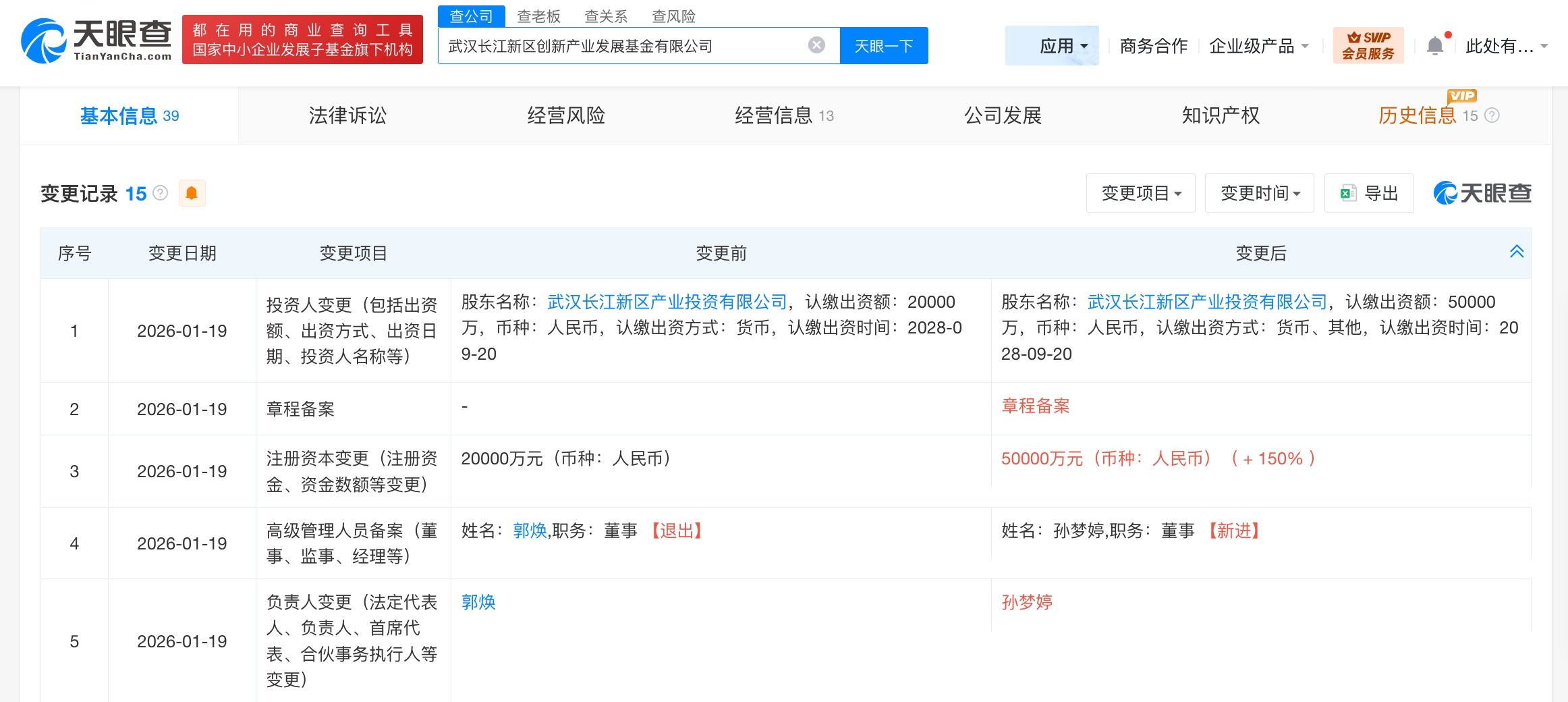 正文 武汉长江新区创新产业发展基金增资至5亿 增幅150% 三木 V管理员 /01-22 /0 评论 /8 阅读 0122 文章最后更新时间2026年01月22日,若文章内容或图片失效,请留言反馈! 天眼查工商信息显示,近日,武汉长江新区创新产业发展基金有限公司发生工商变更,注册资本由2亿人民币增至5亿人民币,增幅150%,同时,法定代表人及部分主要人员也发生变更。 武汉长江新区创新产业发展基金有限公司成立于2023年9月,法定代表人为孙梦婷,经营范围为创业投资、以自有资金从事投资活动、自有资金投资的资产管理服务、融资咨询服务。股东信息显示,该公司由武汉长江新区产业投资有限公司全资持股。 关键词阅读: