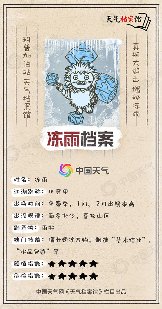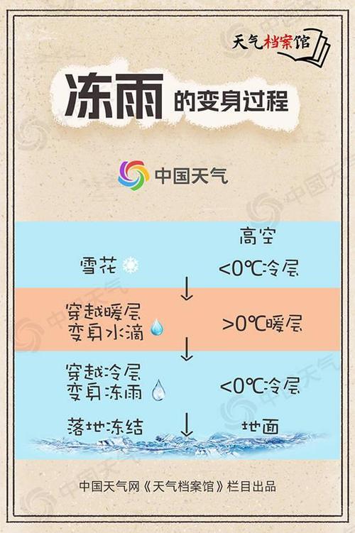 传说中的“天上是雨,落地成冰”,说的就是我。我的诞生,往往伴随着强冷空气或寒潮,是冷暖空气交锋的产物之一。然而,我的形成并非一件简单的事情,我会随着海拔变化而变化,且变身需要满足三个条件。首先,需要强冷空气使得地面温度降至0℃以下;其次,还要有暖湿气流配合形成降水;更为重要的是,大气中必须存在一种特殊的三层结构,就像一块“夹心糖”一样,上下冷、中间暖。