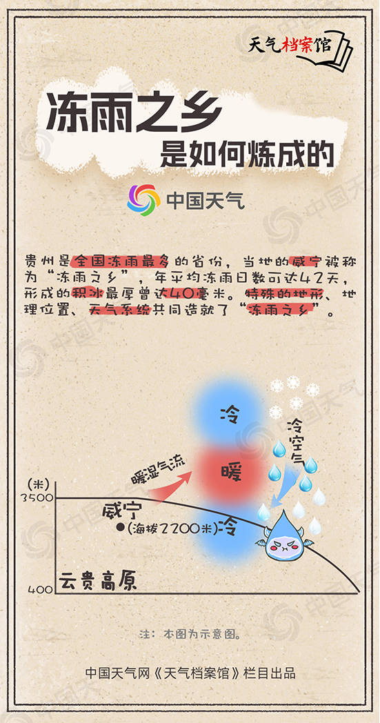 不过纵观全国,我最爱的还是贵州,这里有著名的“冻雨之乡”。贵州雨日多、地势高、水汽充沛,常形成冷暖冷的夹心层,我就喜欢这种湿润的气候环境。而贵州的威宁县可以说是我的常驻地,平均每年我会去42天,1月去得最多,达15天。在威宁,由我塑造的结冰厚度一般可达10至20毫米,最厚的时候有30至40毫米。