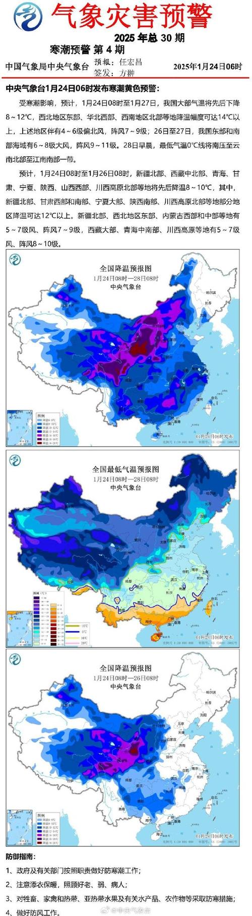 另外,未来三天,西藏西部、新疆西部、江南中北部、西南地区东部、山东半岛、黑龙江中东部等地部分地区有小到中雪或雨夹雪,其中,新疆西南部、西藏西南部的部分地区有大到暴雪,局地有大暴雪。