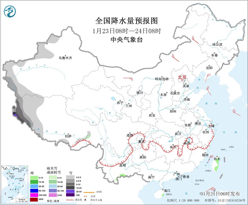 1月23日08时至24日08时,新疆西部、西藏西南部等地部分地区有小到中雪,其中,西藏西南部有大到暴雪,局地大暴雪(20~28毫米)。云南南部、台湾岛东部等地部分地区有小雨。内蒙古、辽东半岛、山东半岛等地部分地区有4~5级风。南海东北部海域、巴士海峡将有6~7级风、阵风8级。
