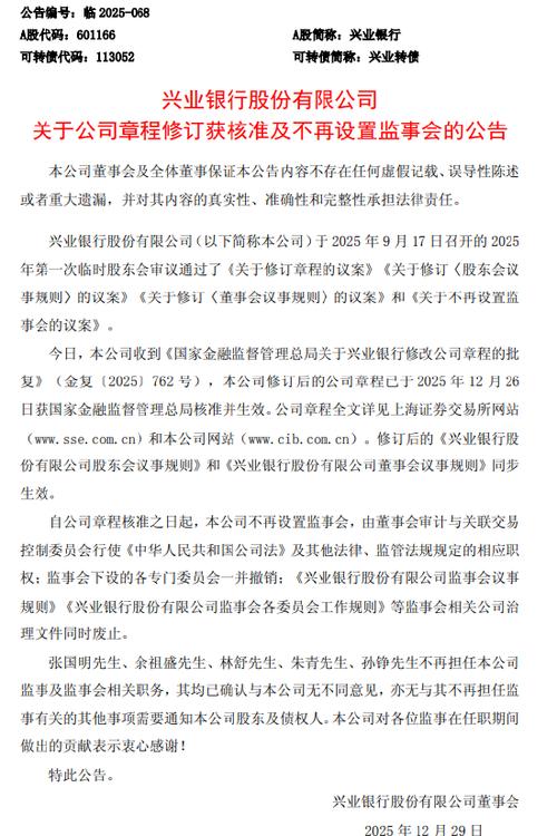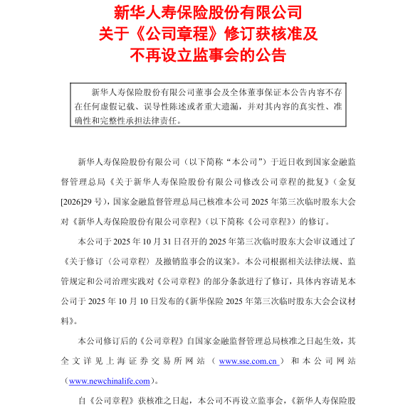 正文 新华保险:公司章程修订获核准,不再设立监事会 三木 V管理员 /01-22 /0 评论 /8 阅读 0122 文章最后更新时间2026年01月22日,若文章内容或图片失效,请留言反馈! 1月21日,新华保险发布公告称,公司于近日收到金融监管总局《关于新华人寿保险股份有限公司修改公司章程的批复》(金复29 号),已核准公司 2025 年第三次临时股东大会对《新华人寿保险股份有限公司章程》(以下简称《公司章程》)的修订。 自《公司章程》获核准之日起,公司不再设立监事会,《新华人寿保险股份有限公司监事会议事规则》同时废止;刘德斌、余建南、汪中柱和刘崇松不再担任公司监事,上述监事确认与公司无意见分歧,亦无任何需要通知公司股东注意的事项。 关键词阅读: