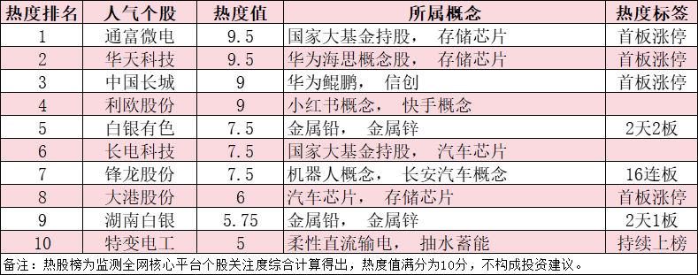 今日,A股十大人气热股如下:通富微电、华天科技、中国长城、利欧股份、白银有色、长电科技、锋龙股份、大港股份、湖南白银、特变电工。