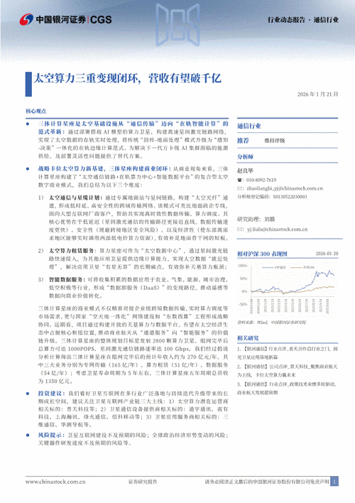 战略卡位太空算力新基建,三体星座构建商业闭环:从商业视角来看,三体计算星座构建了“太空通信链路+在轨算力中心+智能数据平台”的复合型太空数字商业模式,我们总结为以下三个维度: