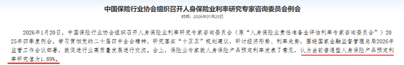 1月20日,中国保险行业协会组织召开人身保险业利率研究专家咨询委员会(原人身保险业责任准备金评估利率专家咨询委员会)2025年四季度例会。会上,保险业专家就人身保险产品预定利率发表了意见,认为当前普通型人身保险产品预定利率研究值为1.89%。