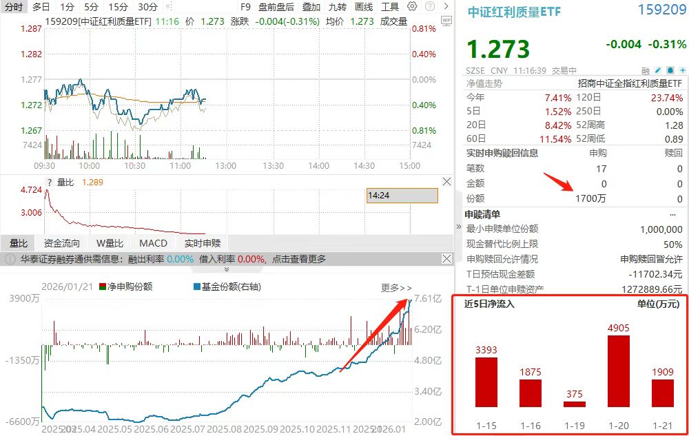 1月22日,两市平盘震荡。数据显示,截至11时14分,表征板块的中证红利质量ETF(159209)跌0.31%,资金热度不减,据Wind Level2实时行情结合均价预估,盘中净流入超2200万,截至发稿,该基金获资金连续第10日净流入,份额持续攀升至历史新高。