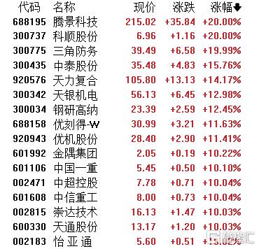 截至发稿,腾景科技、科顺股份、三角防务、中国一重、中超控股、中信重工、天通股份、鹏鼎控股等20多只个股涨停。