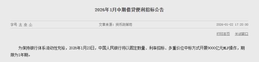 正文 央行将开展9000亿元1年期MLF操作 本月净投放规模达7000亿元 三木 V管理员 /01-23 /0 评论 /9 阅读 0123 文章最后更新时间2026年01月23日,若文章内容或图片失效,请留言反馈! 据中国人民银行官网发布公告显示,为保持银行体系流动性充裕,2026年1月23日,央行将以固定数量、利率招标、多重价位中标方式开展9000亿元1年期中期借贷便利(MLF)操作。Wind数据显示,本月有2000亿元MLF到期,此次操作后将实现7000亿元净投放,这也是央行连续11个月加量续作MLF,凸显货币政策延续支持性立场,助力稳定市场资金面。 银行频道更多独家策划、专家专栏,免费查阅>>