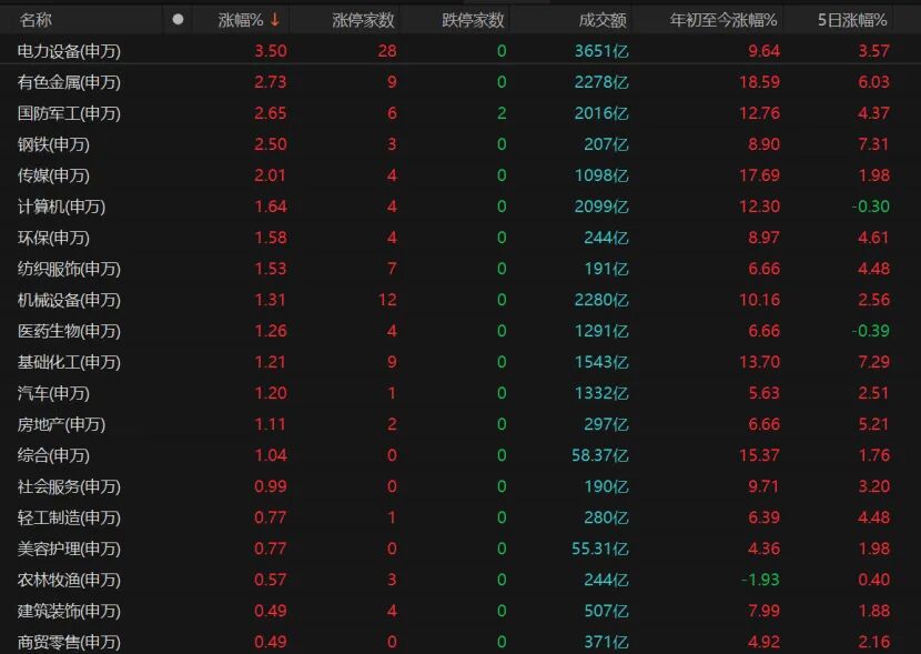 23个申万一级行业收涨,电力设备、有色金属、国防军工、钢铁、传媒领涨,计算机、环保、纺织服饰、机械设备、医药生物、基础化工、汽车、房地产均表现不错。通信收跌1.52%,银行、煤炭、交通运输微跌,家用电器、食品饮料等大消费领域表现弱势。