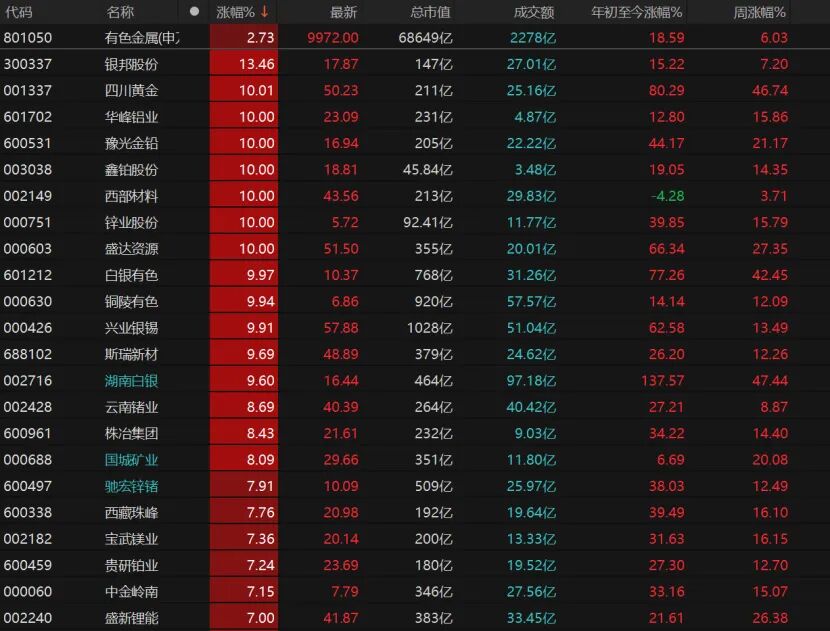 9只有色金属个股涨停,豫光金铅、鑫铂股份、西部材料、白银有色等均涨停。