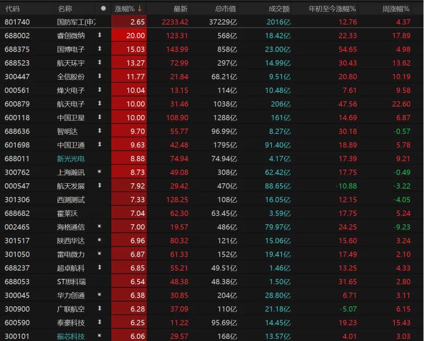 国防军工板块也表现不错,睿创微纳“20cm”涨停,国博电子、航天环宇、全信股份涨幅均超过10%,烽火电子、航天电子、中国卫星均涨停。