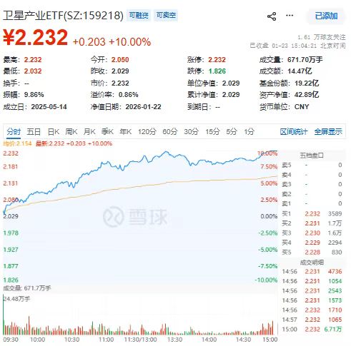 1月23日,卫星板块持续强势。卫星产业ETF(159218)收涨10.00%,前几大权重股方面,中国卫星,航天电子涨停封板,中国卫通涨9.65%,中科星图涨16.03%。成交额约14.5亿。
