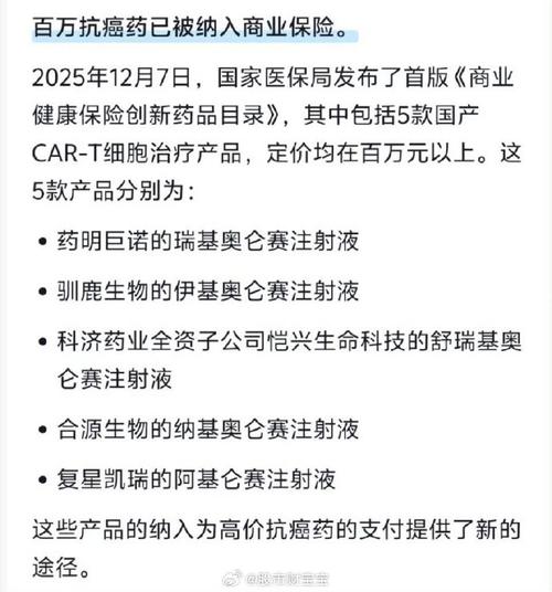 包括药明巨诺(02126.HK)瑞基奥仑赛注射液(商品名:倍诺达)、驯鹿生物伊基奥仑赛注射液(商品名:福可苏)、合源生物纳基奥仑赛注射液(商品名:源瑞达)、复星医药(600196.SH;02196.HK)旗下复星凯瑞阿基仑赛注射液(商品名:奕凯达)、科济药业(02171.HK)泽沃基奥仑赛注射液(商品名:赛恺泽)在内,5款国产CAR-T产品均成功入选商保创新药目录。根据国家医保局,首版商保创新药目录已于1月1日正式落地实施。