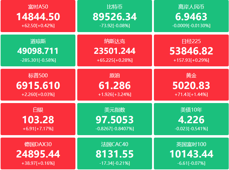 外盘:市场继续评估贸易紧张局势和地缘政治风险因素,美股收盘涨跌不一,其中道指跌285.30点,跌幅0.58%报49098.71点;纳指涨65.22点,涨幅0.28%报23501.24点;标普500涨2.26点,涨幅0.03%报6915.61点;本周道指累跌0.53%,标普下跌0.35%,纳指跌0.06%;贵金属板块领涨,泛美白银涨超4%。科技股涨跌不一,微软、奈飞涨超3%,AMD、亚马逊涨超2%;英特尔跌超17%,创2024年8月以来最大单日跌幅;中概股涨跌不一,纳斯达克中国金龙指数收跌0.26%,小鹏汽车跌超3%,蔚来、阿里巴巴跌超2%,霸王茶姬、微博跌超1%;有道涨超4%,新东方涨超2%,携程涨超1%。