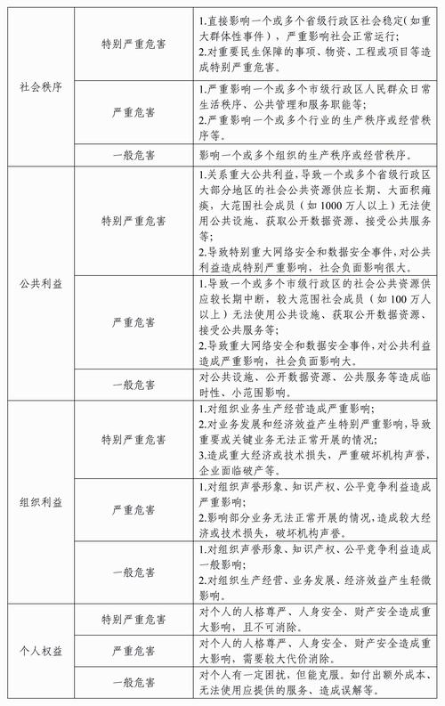 影响程度是指数据一旦遭到泄露、篡改、损毁或者非法获取、非法使用、非法共享,可能造成的影响程度。影响程度从高到低分为特别严重危害、严重危害、一般危害。
