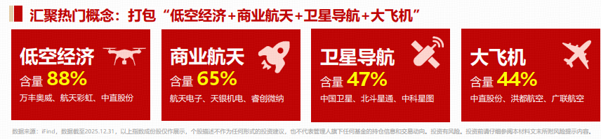 大国之翼,大展鸿图!通用航空ETF华宝(159231)及联接基金(A类:024766;C类:024767)标的指数全面覆盖50只航空航天成份股,涵盖低空经济、商业航天、卫星导航、大飞机、无人机、军用飞机等热门领域,其中低空经济概念含量超88%,商业航天含量超65%,卫星导航概念超47%,是一键配置中国航空航天产业链的利器。(截至2025.12.31)