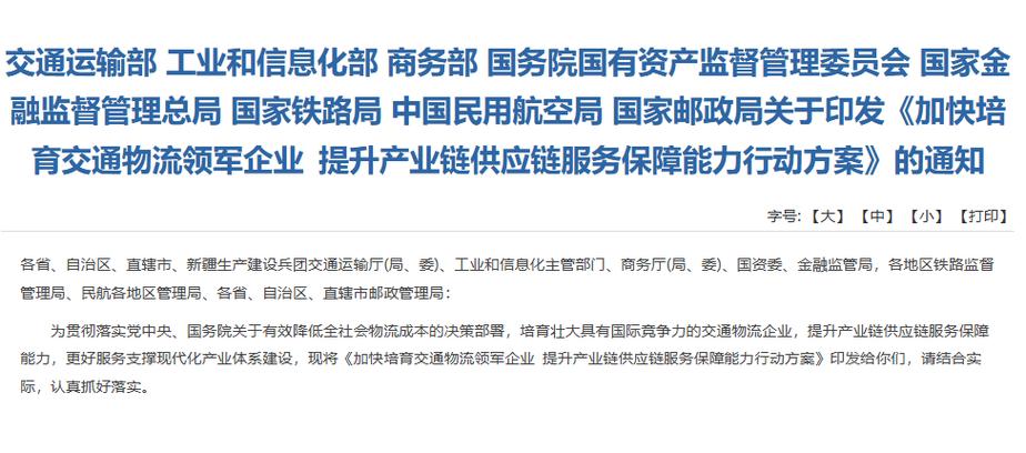 中新网1月23日电 据交通运输部微信公众号消息,日前,交通运输部联合工业和信息化部、商务部、国务院国有资产监督管理委员会、国家金融监督管理总局、国家铁路局、中国民用航空局、国家邮政局印发《加快培育交通物流领军企业 提升产业链供应链服务保障能力行动方案》,支持交通物流领军企业拓展服务网络、提升全链条一体化交通物流服务能力、深化与产业链供应链融合发展、加速交通物流数智化赋能、增强交通物流安全韧性。到2030年,力争打造100家左右综合物流集成商,其中具有全球辐射力和国际竞争力的交通物流领军企业10家以上。