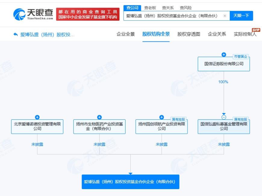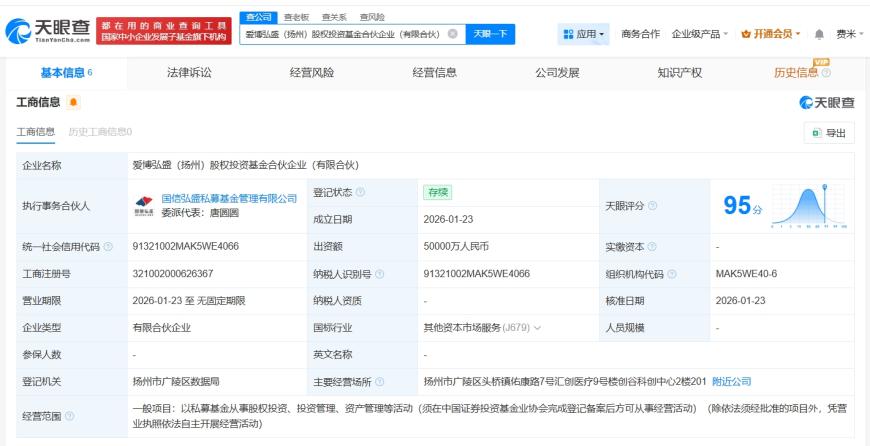 正文 国信证券等在扬州成立股权投资基金 出资额5亿 三木 V管理员 /01-27 /0 评论 /8 阅读 0127 文章最后更新时间2026年01月27日,若文章内容或图片失效,请留言反馈! 天眼查显示,近日,爱博弘盛(扬州)股权投资基金合伙企业(有限合伙)成立,执行事务合伙人为国信弘盛私募基金管理有限公司,出资额5亿人民币,经营范围为以私募基金从事股权投资、投资管理、资产管理等活动,由国信证券(002736)旗下国信弘盛私募基金管理有限公司、扬州园创领航产业投资有限公司、北京爱博诺德投资管理有限公司、扬州市生物医药产业投资基金(有限合伙)共同出资。 关键词阅读: