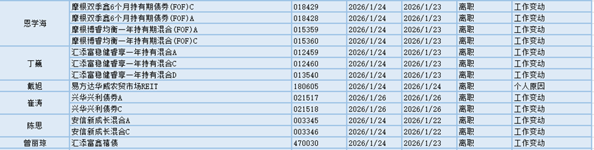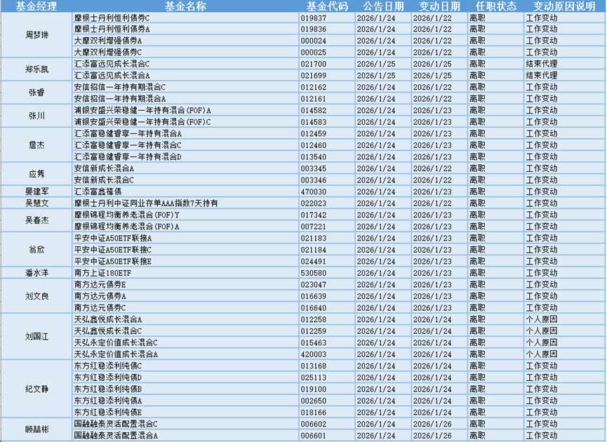 基金经理是一只基金产品最核心的成员,能决定一只基金的投资方向、投资策略以及投资风格,基金经理出色的择时选股能力和调研预测能力是基金业绩的有力保证,所以基金经理是投资者在选择基金产品时的重要依据。基金经理的变动很大程度上会影响到基金产品未来的表现,是一个需要特别关注的信息。1.24-1.26日共有39位基金经理发生任职变动。