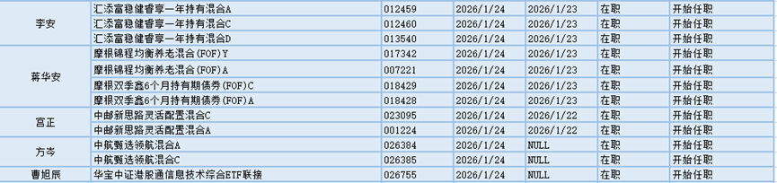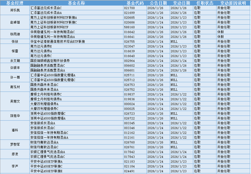 新基金经理上任方面,其中(1.24-1.26)日有47只基金产品发布基金经理任职公告,涉及20名基金经理。汇添富基金许一尊现任基金资产总规模为54.60亿元,管理过的基金多为指数型和债券型基金,任职期间回报最高的产品是汇添富中证500指数增强A(001050),为指数型基金,在任职的10年又66天时间内获得132.77%的回报,至今仍在管理该基金。许一尊新任汇添富中证A500指数量化增强A、汇添富中证A500指数量化增强C这两只基金产品的基金经理。