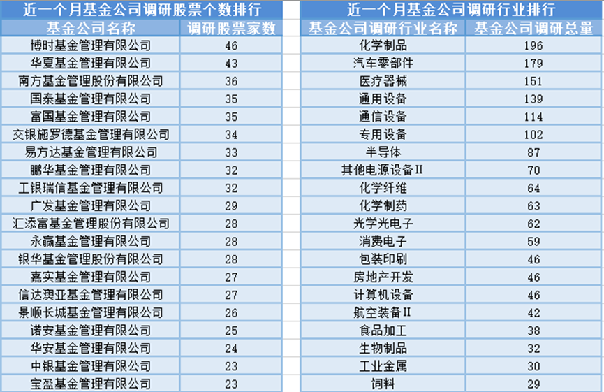近一个月(12月27日-1月26日),博时基金参与公司调研的数量最多,共调研46家上市公司,此外调研较为活跃的还有华夏基金、南方基金和国泰基金,分别调研43家、36家、35家上市公司;从调研行业上来看,基金公司对化学制品行业的上市公司调研次数最多,共有196次,其次是汽车零部件行业,基金公司调研了179次。
