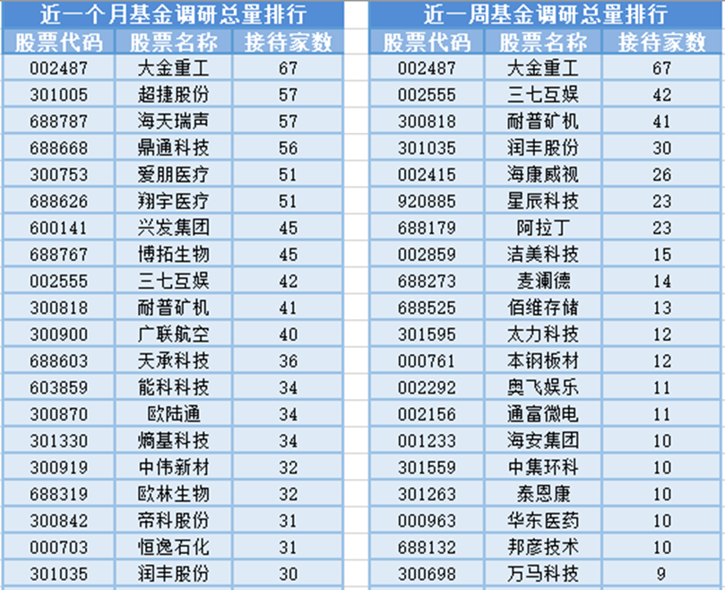 将时间周期缩短到最近一周(1月19日-1月26日)来看,基金调研数量第一的公司是大金重工,大金重工属于金属制品行业,主营业务为生产销售海上风电单桩基础、过渡段、导管架、浮式基础以及塔筒产品,为客户提供海上风电装备的“建造+运输+交付”一站式综合解决方案,可满足全球不同地区海上风电项目的多样化需求。大金重工共被67家基金机构调研,其次被调研数量较多的股票是三七互娱、耐普矿机和润丰股份,分别接受42家、41家和30家基金机构的调研。