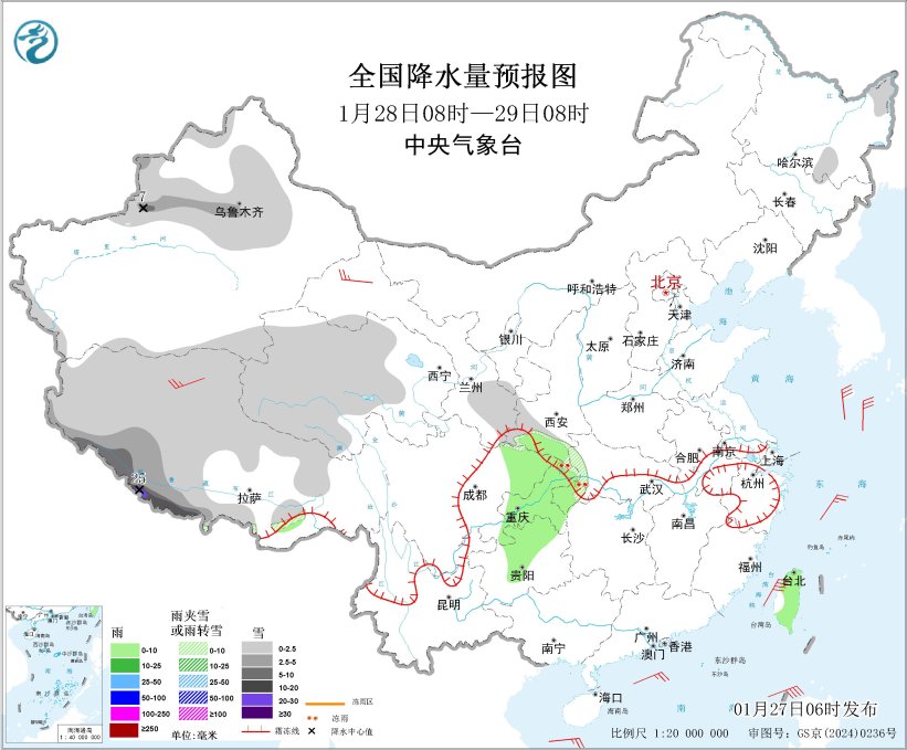 图1 全国降水量预报图(1月27日08时-28日08时) 图片来源:中央气象台网站