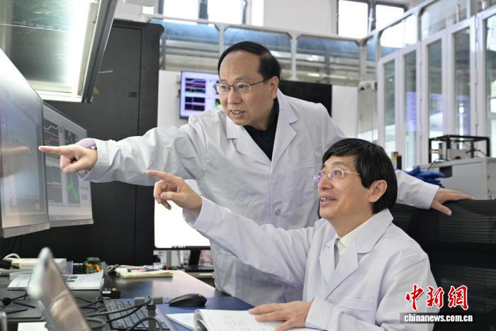 王秋良院士(右)与雒建林研究员讨论数据。联合团队 供图