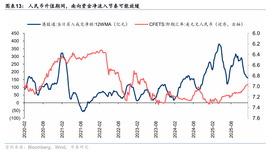 人民币升值有望推高海外资金对于中国权益资产的关注度和风险偏好,不过对于港股,可能同时放大南向资金净流出的压力。从2016年以来的数据看,人民币升值与海外共同基金净流入中国资产的规模显著正相关,港股的相关性系数和显著性较A股更高,A股外资净流入的波动性较港股更大。我们理解可能的原因的是港股本身是外资配置中国资产的主力,同时,港股以美元为报表和交易货币,但多数公司以人民币为功能货币,人民币升值,这类公司的盈利和净资产在换算回美元入表时,会产生更多的折算收益,估值吸引力提升。另一方面,对于南向资金,人民币升值可能降低港股的估值吸引力。从2020年以来的数据看,人民币升值与港股通净流入规模显著负相关。不过整体看,人民币升值对港股的影响偏积极。