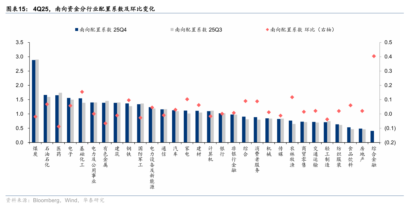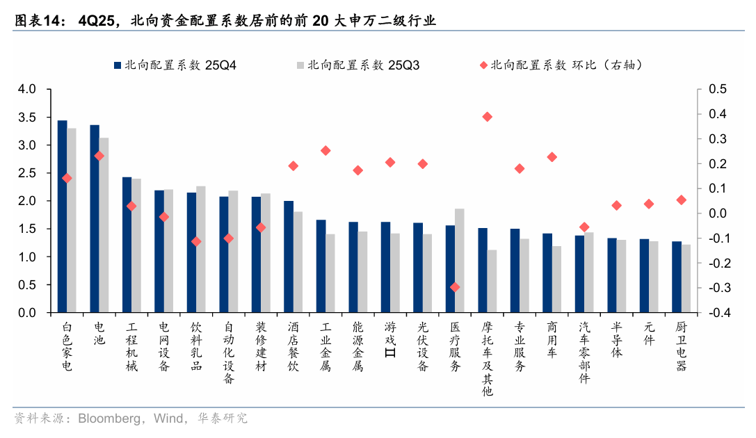 对于行业配置,从资金的流向的角度,无论是A股或是港股,外资偏好的行业在人民币升值期间更可能获得外资净流入,港股需要进一步考虑南向偏好的行业的资金净流出风险。从4Q25北向资金的分行业持仓看,外资资金的审美是与时俱进的,当前显著超配的行业主要集中在中国在全球具备强竞争力的中游制造板块,配置系数居前的前5大行业为白电、电池、工程机械、电网设备、饮料乳品,更可能受益于外资潜在的净流入。从4Q25南向资金的分行业持仓看,目前显著超配的前三大行业为煤炭、石油石化和医药,从资金视角,可能需要适度规避。