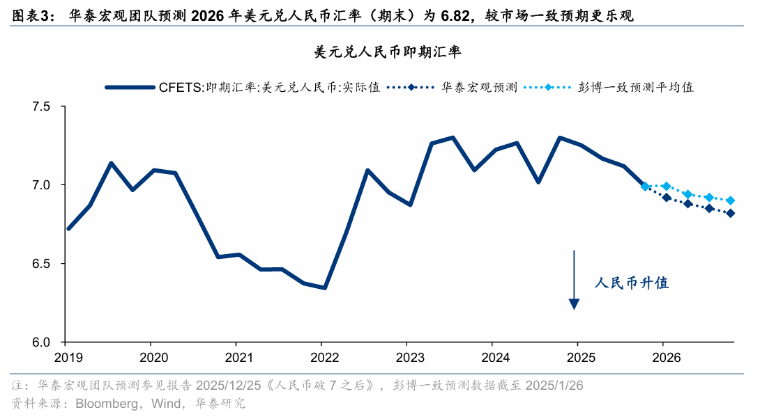 展望看,人民币仍有进一步升值的潜力和动力。第一,2022 年 4 月至今年 6 月,人民币实际有效汇率累计回调 19%,为 1990 年以来最大的一轮调整周期,当前的人民币汇率具有较强的竞争力。第二,近年来,随着国内产品的竞争力进一步增强,成本优势进一步扩大,中国贸易顺差的绝对值和全球占比持续攀升,成为人民币升值的动力。第三,中国企业与金融机构长期偏好配置海外资产,随着人民币汇率风险调整后的预期更为中性,跨境资本回流潜力较大,同样有利于人民币升值。最后,更有力的财政宽松以扩大内需,以及中美关系进一步缓和则是人民币进一步升值可能的潜在动力。华泰宏观团队预测,2026年美元兑人民币的期末汇率为6.82(2025/12/25《人民币破 7 之后》)。
