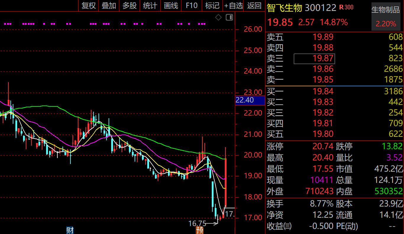 1月26日,智飞生物(300122)迎来显著反弹,涨幅高达14.87%,单日每股上涨约2.57元,收盘价来到19.85元附近,盘中成交活跃度显著提升。