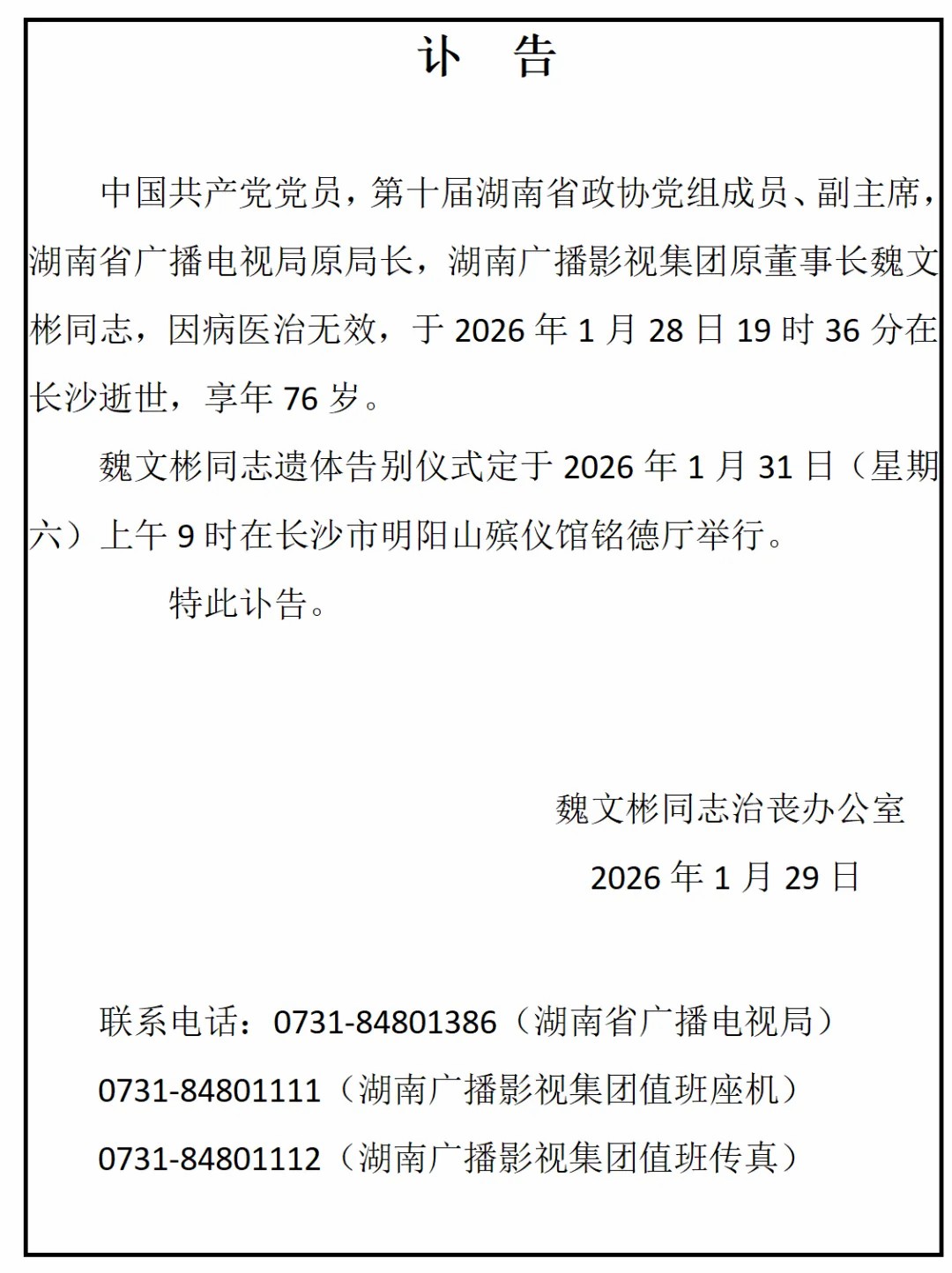 中新网1月29日电 据湖南省广播电视局微信公众号消息,中国共产党党员,第十届湖南省政协党组成员、副主席,湖南省广播电视局原局长,湖南广播影视集团原董事长魏文彬同志,因病医治无效,于2026年1月28日19时36分在长沙逝世,享年76岁。