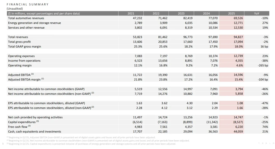 2025年四季度,特斯拉的财报数据出现下滑。据特斯拉披露,2025年四季度交付新车41.8万台,同比环比均下滑约16%,全年交付量低于2024年和2023年的水平。尽管汽车销量下滑,但特斯拉的储能业务发展迅猛,2025年部署量同比增长49%达到46.7GWh,创下历史纪录,四季度毛利达到11亿美元。经营状况方面,2025年四季度总营收为249.01亿美元,同比下滑3%,环比下滑11.4%;全年总营收948.27亿美元,同比下滑3%。四季度净利润(GAAP)为8.4亿美元,同比下滑60.5%,环比下滑38.8%;全年净利润为37.94亿美元,同比下滑约46%。特斯拉在财报中解释称,净利润大幅下滑主要是AI项目研发投入、股权激励费用、重组支出导致运营费用增加等原因导致。截至1月28日美股收盘,特斯拉股价为431.460美元,增长0.13%,总市值为1.43万亿美元。