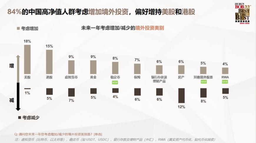84%的受访高净值人群考虑境外投资,其中U35热情度最高,45岁以上受访者热情度最低。从净增长/减少意向(即增加者比例与减少者比例相减)来看,美股投资的净增长意向为17%,港股投资的净增长意向为10%,增持意愿明显。稳定币和黄金的净增长意向均为4%,较倾向于增持。房产投资的净减少意向为 6%,减持意愿明显。虚拟货币、保险、银行存款及理财产品、RWA(真实资产代币化,如代币化国债)等投资类别,增减意愿分化。