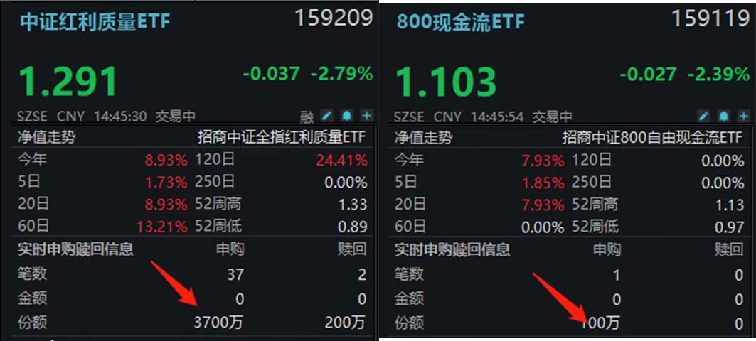 1月30日,两市巨幅调整。午后低费率中证红利质量ETF(159209)、800现金流ETF(159119)成交持续放量,盘中逆市揽金!