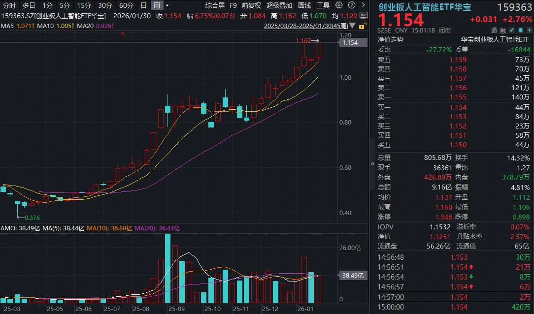 热门ETF方面,双线布局“算力+AI应用”的创业板人工智能ETF(159363)场内收涨2.76%创收盘新高,单日放量成交9.16亿元,周线斩获十连阳!