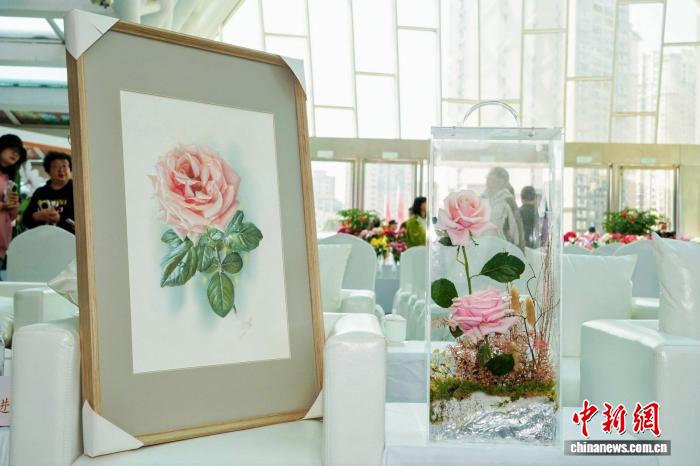 图为曾孝濂绘制的“娇龙”月季画作(左)和移交给新疆昭苏县的“娇龙”月季鲜切花(右)。陈创业 摄