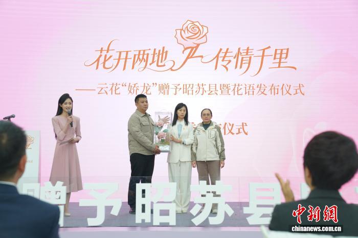 中新网昆明2月2日电 (陈静)“花开两地 传情千里”——云花“娇龙”赠予昭苏县暨花语发布仪式2日在云南昆明举行。云南省农业科学院花卉研究所育种团队将“娇龙”月季郑重交接给昭苏县代表,花语“若为热爱,便所向披靡”正式发布。
